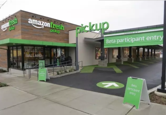 在“學(xué)習(xí)傳統(tǒng)零售”這方面,亞馬遜在今年3月份內(nèi)測了自己的“生鮮提貨點(Amazon Fresh Pickup)”,整體邏輯類似于傳統(tǒng)店的“開車自提”。